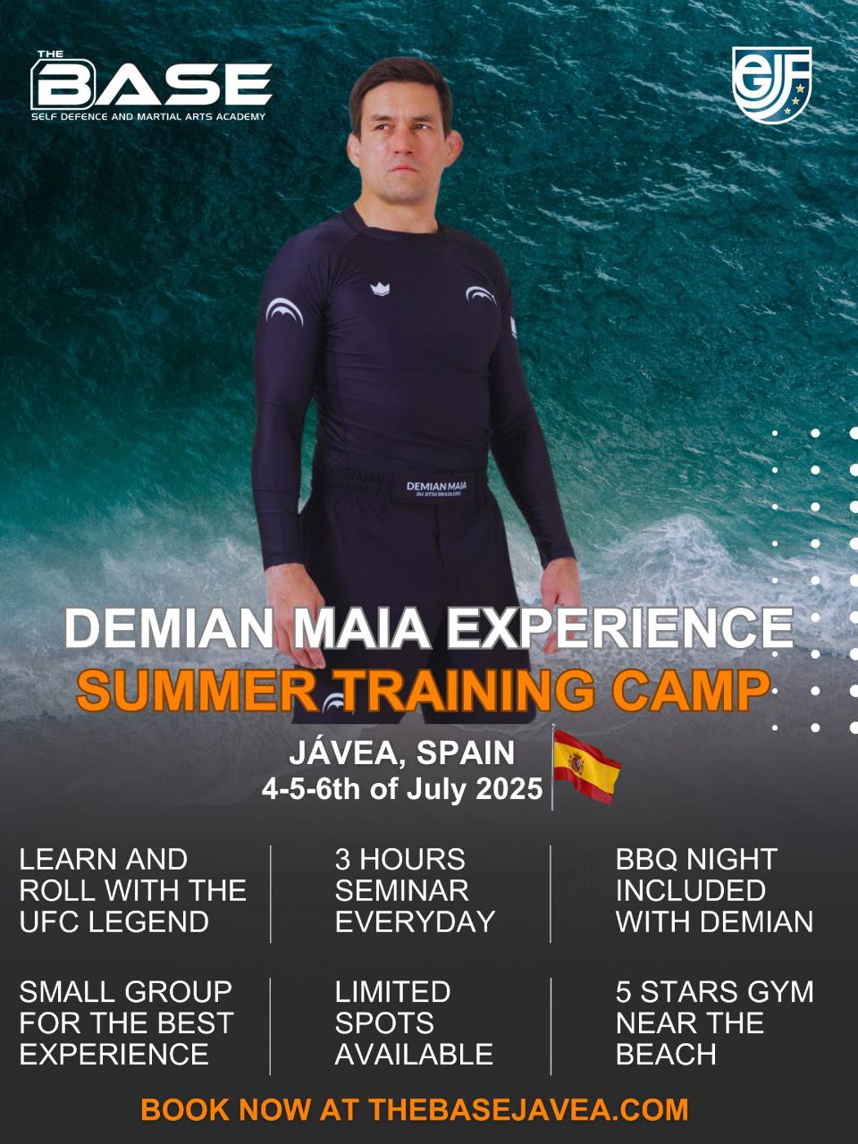 Join us for an unforgettable experience at The Base Jávea, a unique venue located on the Mediterranean coast, just steps from the beach. This three-day training camp, led by Demian Maia, a legend of Brazilian Jiu-Jitsu and the UFC, offers you the opportunity to refine your Jiu-Jitsu and MMA skills in a luxury setting.